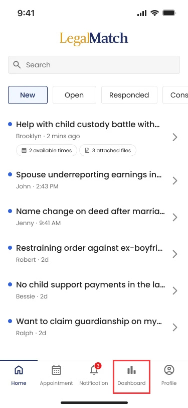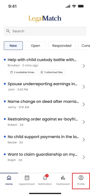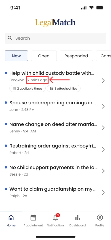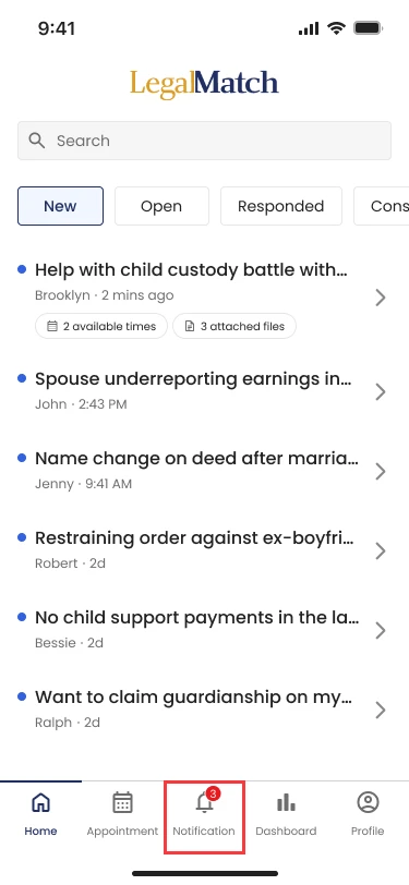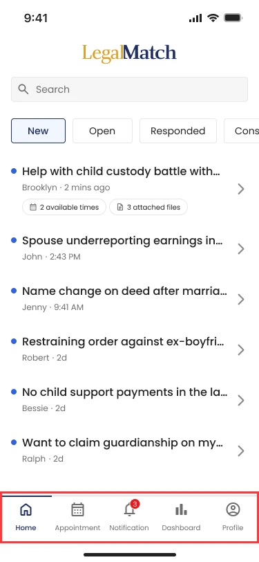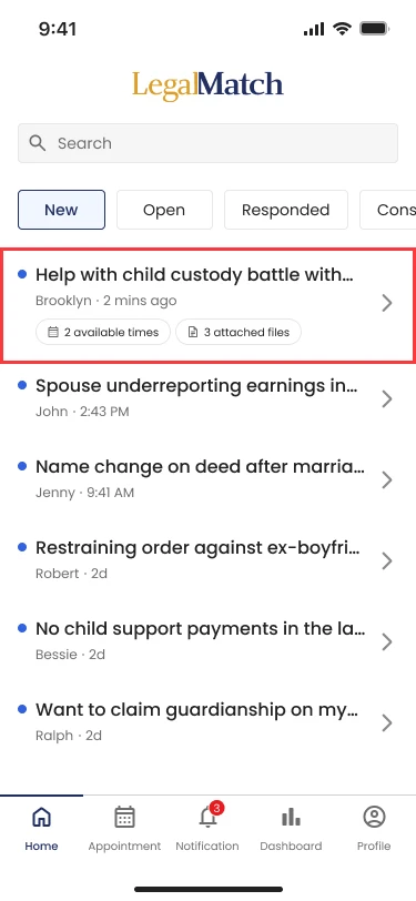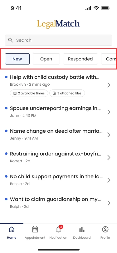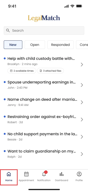 On the homepage, you can tap the case view tabs to see lists of the cases that are NEW, OPEN, RESPONDED, CONSULTATION COMPLETED, and ENGAGED.