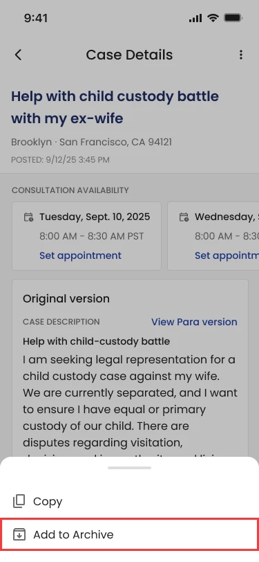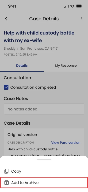 To archive a case, simply tap the three-dot “kebab” menu to access that option.