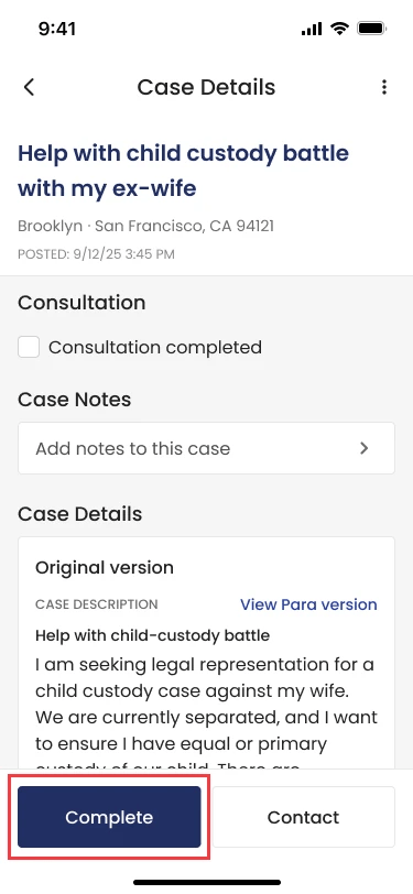 Once you finish working on a LegalMatch case, please click the COMPLETE button and provide additional feedback to help us better understand the kind of cases you consider to be of the highest quality and greatest value to you.