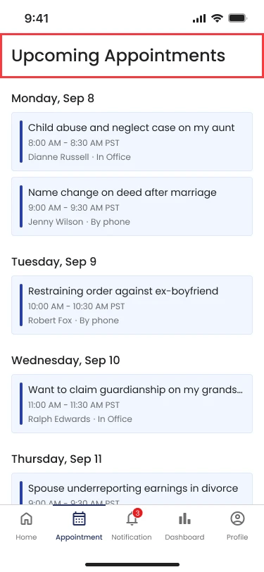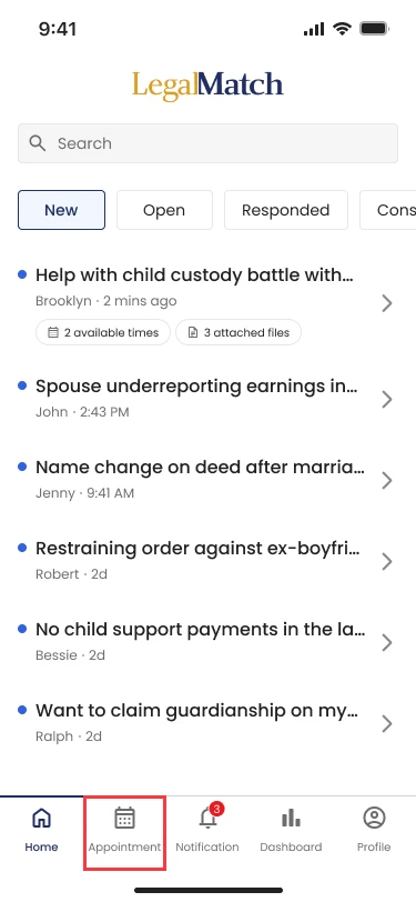 To keep track of your appointments, tap the Upcoming Appointment icon where you can view all the initial consultation appointments you and the clients have scheduled.