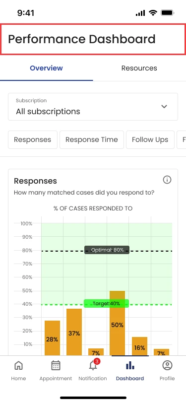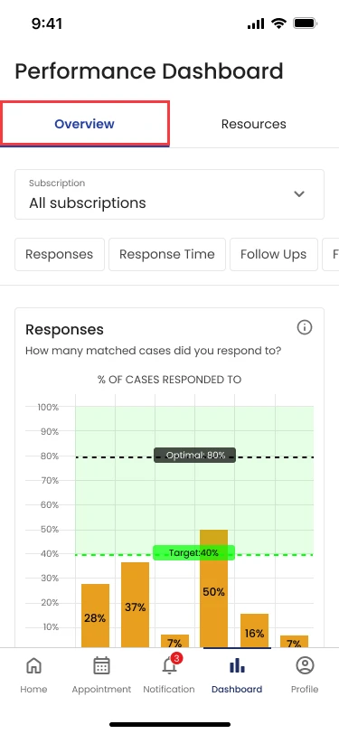Under the Overview tab, you will see here how many matched cases you have responded to, how long it takes for you to respond to a case, how many cases you have followed up with, and how long it takes you to follow up.