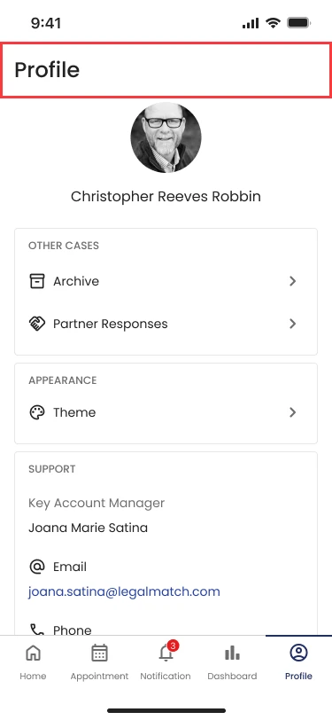 The user icon takes you to a page from which you can access the other cases (ARCHIVED, PARTNER RESPONSES), as well as contact information for your dedicated Key Account Manager (KAM), the Terms and Privacy Policy pages, Setting to make the Performance Dashboard your homepage, and the option to Sign Out of the app.